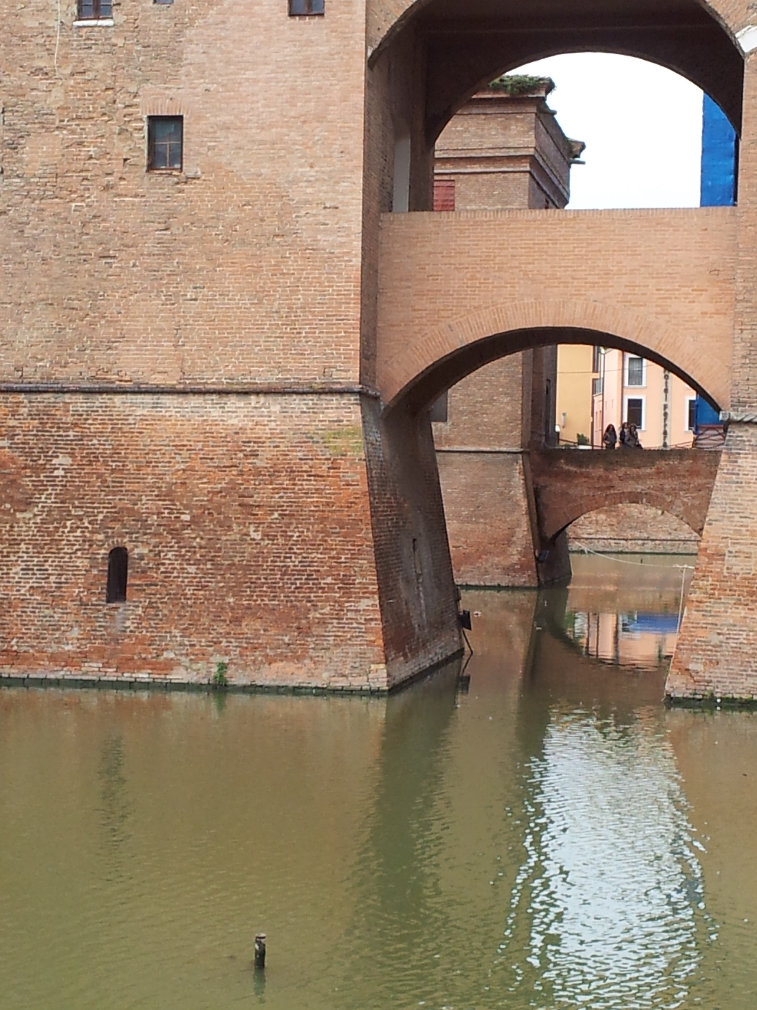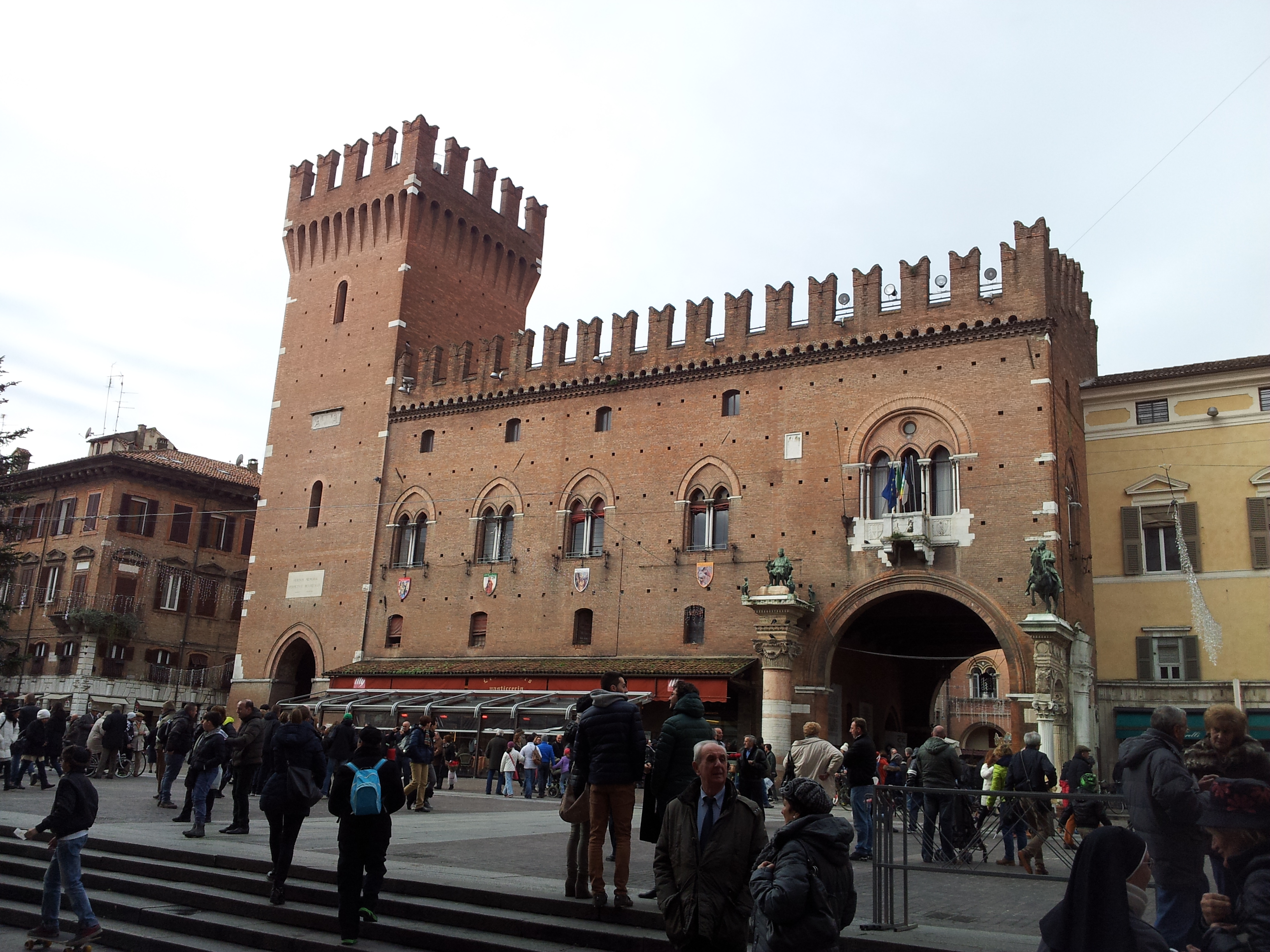 Al día siguiente nos fuimos en tren hasta Ferrara, el tiempo del trayecto varia en función de lo que os queráis gastar y del tipo de tren que cojáis y oscila entre los 20 y los cais 50 minutos, desde la estación de Ferrara al centro tenéis un paseito, aunque tambien tenéis autobuses que os acercan al centro. Andando hay dos formas de acceder al centro, o por las murallas o por la zona más moderna que desemboca directamente en el palacio. Ferrara es una ciudad pequeña y muy asequible al viajero, eso si, si vais en festivo no os despistéis a la hora de comer porque se llena todo, nosotros no pudimos comer donde teníamos pensado pero descubrimos un restaurante al que seguramente no hubiéramos entrado pero que comimos estupendamente, se llama I Sofisti, http://www.isofisti.it/#_=_ , y además es barato.No os extrañe, el coger un tren para hacer un excursión, la red de trenes italiana es muy fluida y ciudades como Bolonia son un perfecto nudo ferroviario para realizar visitas a ciudades próximas, nosotros escogimos Ferrarra, pero Modena esta también a 20 minutos, Florencia a menos de una hora, a Padua a partir de una hora, a Venecia también a partir de una hora, a Ravena tardas 1 hora y cuarto, vamos que si os lo organizáis bien podéis montaros un recorrido low-cost por Italia desde Bolonia.